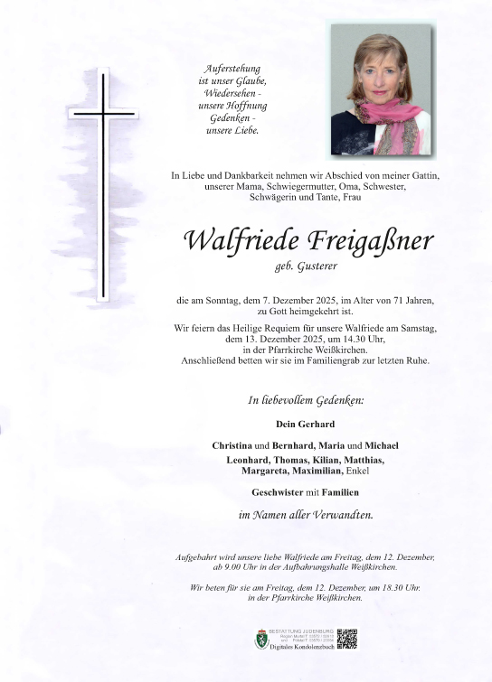 Der Herr sah sie, legte ihr die Hand auf die Schulter und sprach “ Walfriede es ist Zeit komm „. Uns bleibt die Trauer und die Hoffnung der Auferstehung.